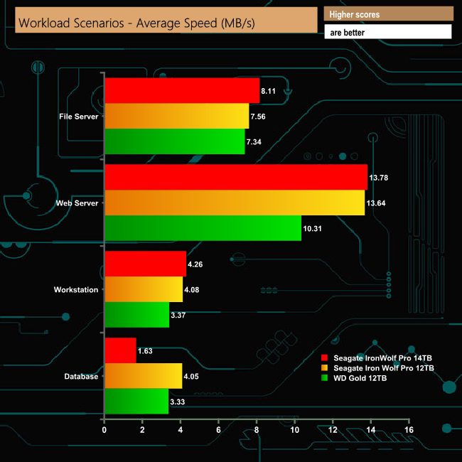 We tested the 14TB IronWolf Pro with a number of scenario’s that it may face in the real world. The settings for these scenarios are as follows.