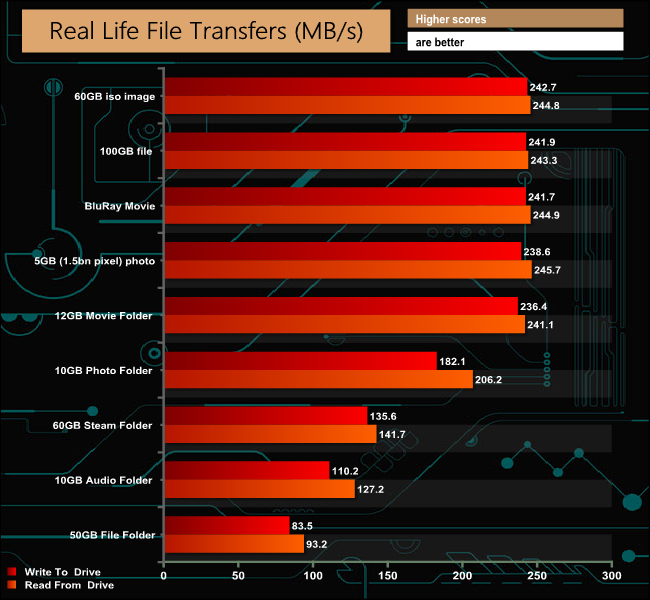 The drive has no problems dealing with our real life file transfers, breaking 100MB/s for all but the 50GB file folder test.