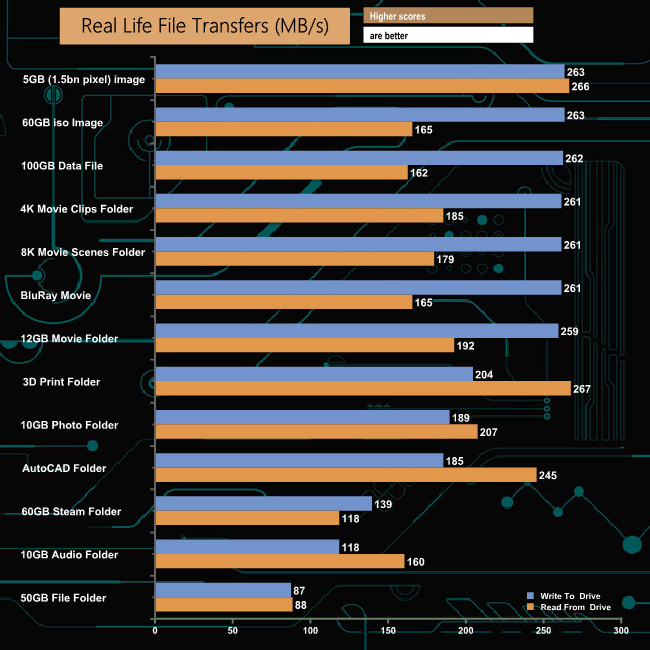 To test real life performance of a drive we use a mix of folder/file types and by using the FastCopy utility (which gives a time as well as MB/s result) we record the performance of drive reading from & writing to a 256GB Samsung SSD850 PRO.