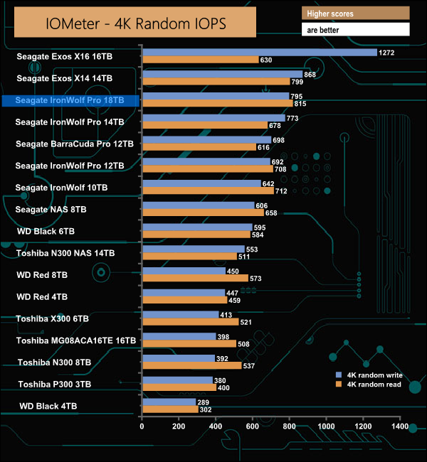We test with both random read and write 4k tests, as shown above. There are many ways to measure the IOPS performance of a hard drive, so our results will sometimes differ from the manufacturer’s quoted ratings. We do test all drives in exactly the same way, so the results are directly comparable.