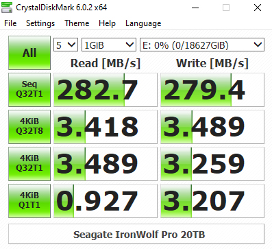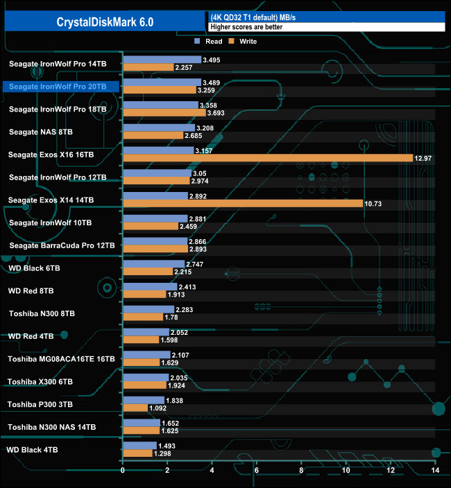 In the CrystalDiskMark 4K QD32 T1 test, the 20TB IronWolf Pro read test result of 3.489MB/s sees it sitting in second place in our results chart just behind the 14TB IronWolf Pro. However, its write result of 3.259MB/s is much better than the 14TB drive but not as fast as the 18TB version which sits in third place.