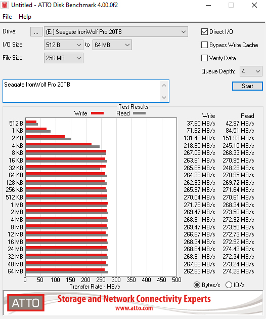 With the ATTO benchmark, we couldn't quite hit the maximum official transfer rate of 285MB/s with read/write results of 273MB/s and 269MB/s respectively.