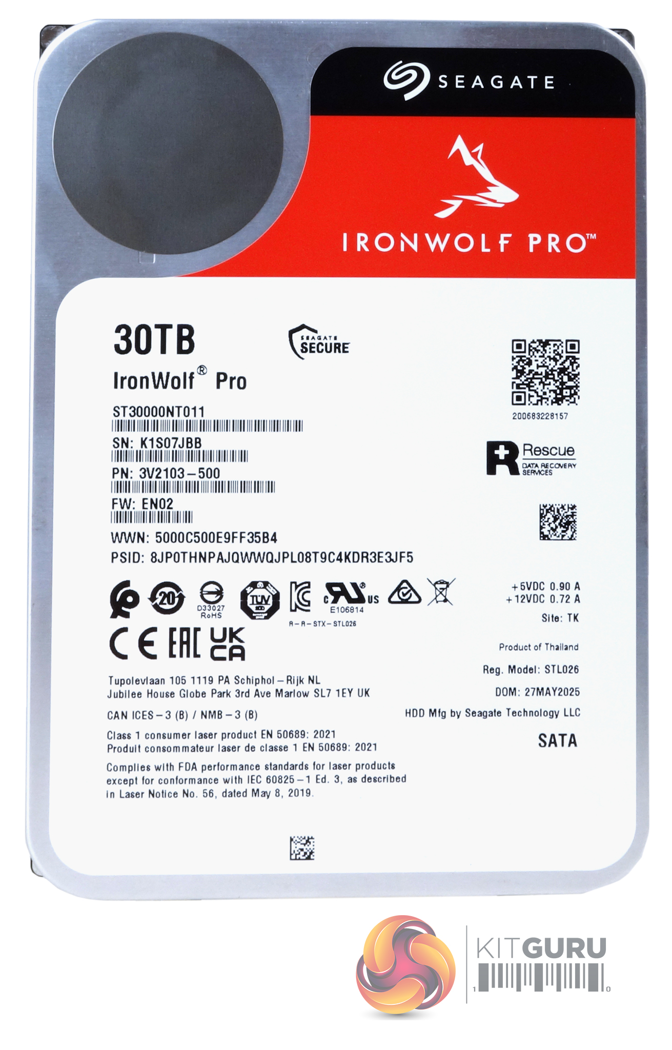Our review sample, IronWolf Pro 30TB, was supplied to us without any retail packaging. The IronWolf Pro 30TB is built on a standard 3.5-inch format but with a thickness of 26.11mm. The drive has a spindle speed of 7,200rpm and there is 512MB of cache.