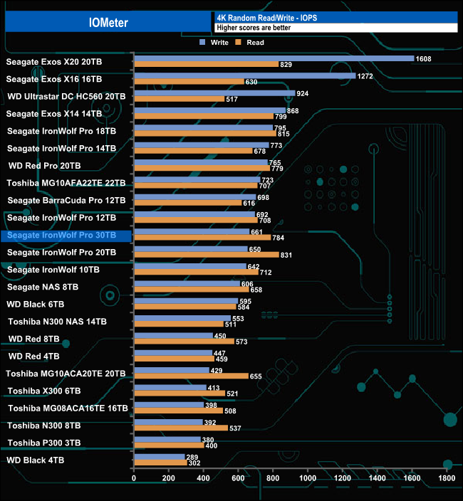 In our 4K random read/write test, the drive produced a write figure of 661 IOPS, which is slower than some other capacities of the IronWolf Pro we've tested. However, its read result of 784 IOPS is one of the fastest we've seen to date for an HDD.