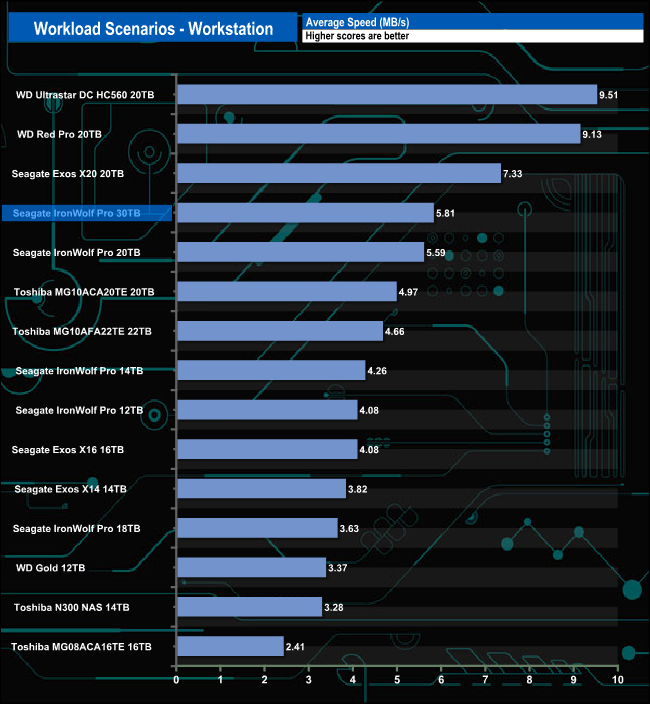The 30TB IronWolf Pro handled the workload scenarios pretty well, with the fastest bandwidth speeds we've seen to date for the File Server test (14.29MB/s). The Web Server test sees the drive in a mid-table position, while for the Workstation test, the drive sits in fourth spot. It didn't fare so well in the Database test with a bandwidth figure of 1.09MB/s which sees it near the bottom of the results chart.