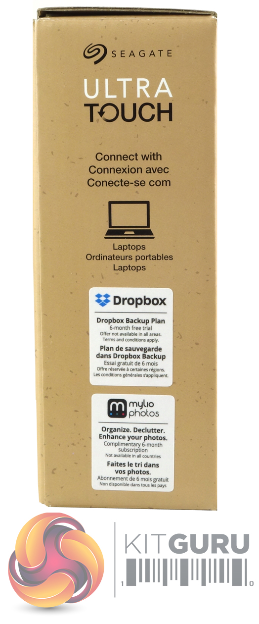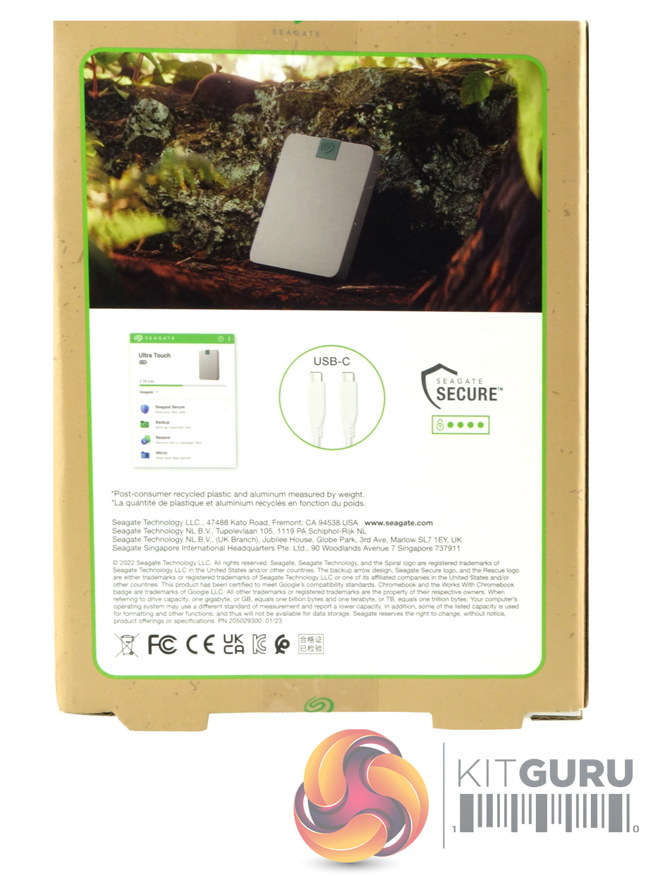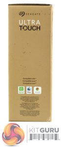 The Ultra Touch HDD comes in a sturdy box with an image of the drive on the front. On the top right-hand side of the box is a sticker with the drive's capacity and the fact it comes with Seagate's Rescue Data Recovery service. Bottom left of the image is a sticker stating that the product contains a minimum of 30% recycled materials while 100% of the packaging is recyclable.