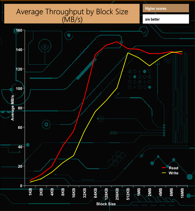 The Canvio Advance drive read performance peaked at the 256KB block size with a figure of 147.97MB/s before gradually dropping back down to finish the test at 135.29MB/s. Writes peaked just before the end of the test at the 8MB block mark at 136.88MB/s