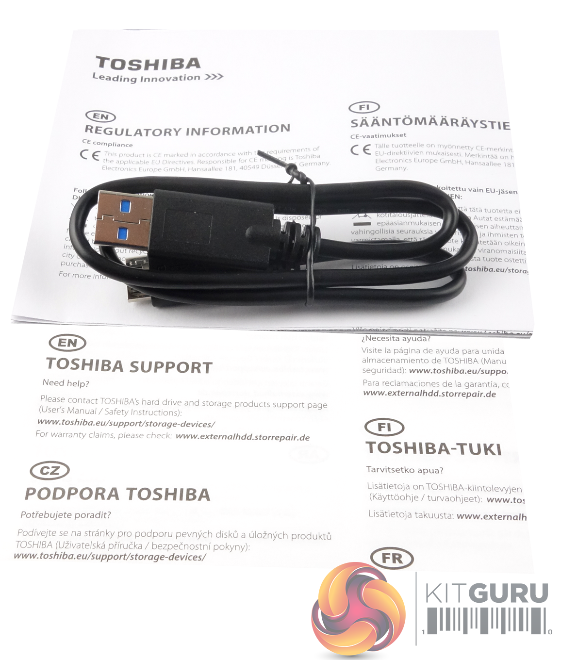 Apart from the drive all that is in the box is a USB 3.0 Type A to Micro-B cable, which could do with being a little longer for PC connections, and two paper information leaflets, one with details on how to contact Toshiba support and the other providing regulatory information. The Canvio Advance’s manual comes pre-loaded on the drive itself.