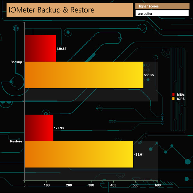 We set IOmeter up (as shown above) to test both backup and restore performance on a 100GB file.
