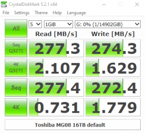Our review sample MG08ACA16TE didn’t handle the CrystalDiskMark 4K tests particularly well, in fact it was a little slower than the 8TB version of the Toshiba N300 we’ve reviewed previously, but on the other hand it was faster than the 14TB N300 NAS.