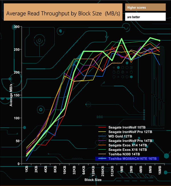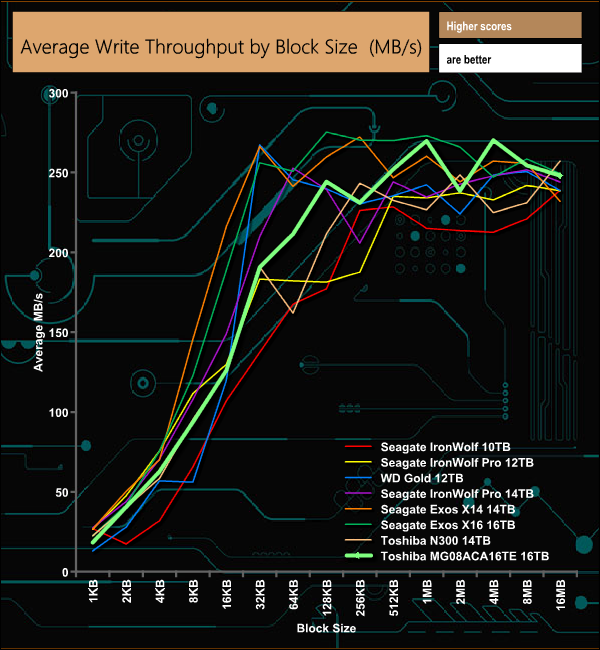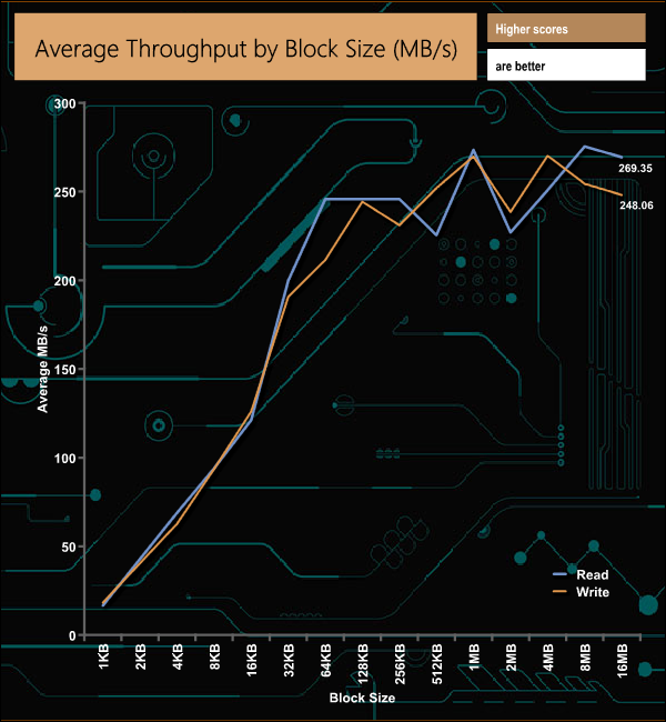 The official maximum transfer speed for the MG08 is up to 262MB/s. In our throughput tests, we saw a little better peak performance than that, with reads peaking at 275MB/s (8MB block size) with writes peaking earlier in the test (4MB block) at 270MB/s.