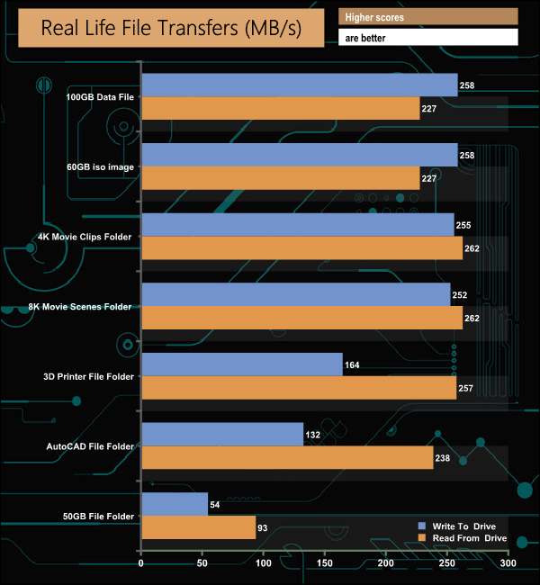 To test the real-life performance of a drive we use a mix of folder/file types and by using the FastCopy utility (which gives a time as well as MB/s result) we record the performance of drive reading from & writing to a 256GB Samsung SSD850 PRO.