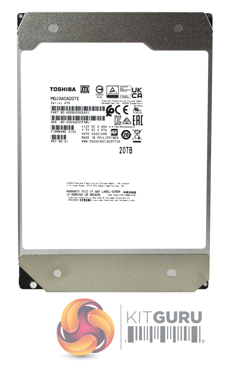 Toshiba's 20TB MG10 is built on a 26.11mm thick, 3.5in format. It uses Toshiba’s fourth-generation Helium technology which in turn enables Toshiba to use ten 2TB platters and 20 heads in the enclosure. The drive has a spindle speed of 7,200rpm and there is 512MB of cache.