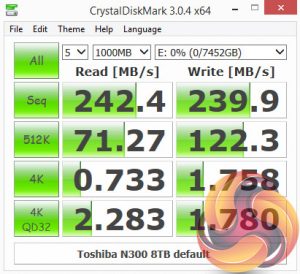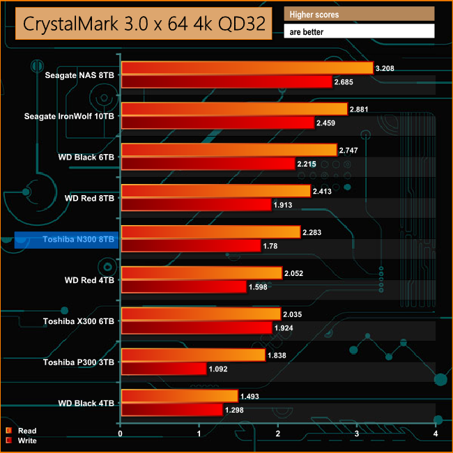 The Toshiba N300's read performance (when it comes to small bity files at a deepish queue depth) is better than both Toshiba's X300 and P300 drives. However, it falls in between both of them in terms of write performance – being much faster than the P300 but not quite as quick as the X300.