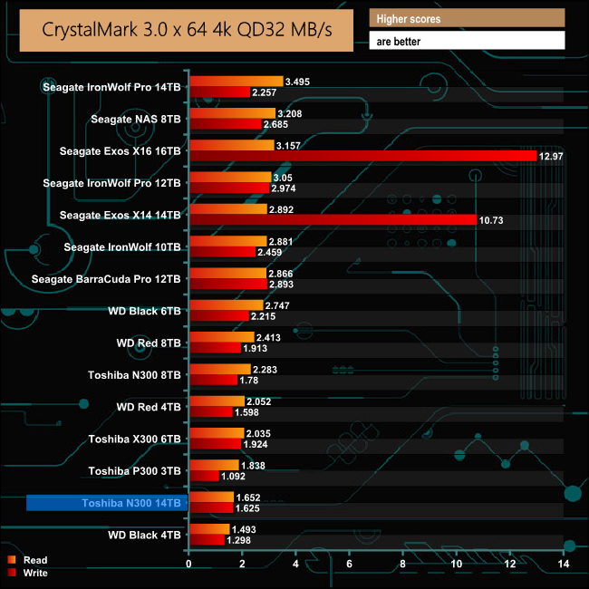 Our review sample 14TB N300 didn't handle the CrystalDiskMark 4K tests particularly well, in fact it was a little slower than the 8TB version we've reviewed previously.