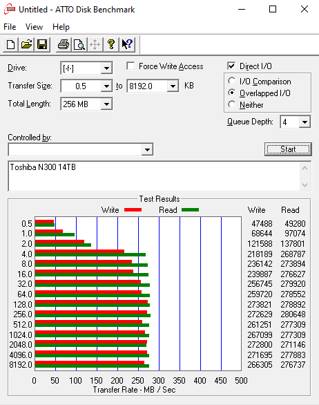Toshiba quote transfer rates for the drive at 260MB/s. With the ATTO benchmark, we managed to squeeze a little more out of the drive with 271MB/s for reads and 272MB/s for writes, making it the second fastest HDD drive we've tested to date behind Seagate's 16TB Exos X16.