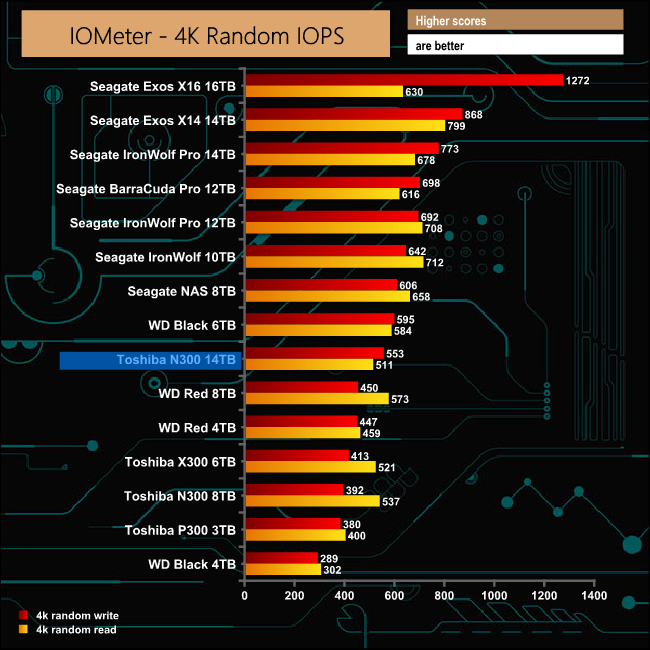 In our 4K random read/write tests the 14TB N300 was slower than the other two 14TB drives on the chart, Seagate's IronWolf Pro and the Exos X14.