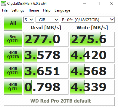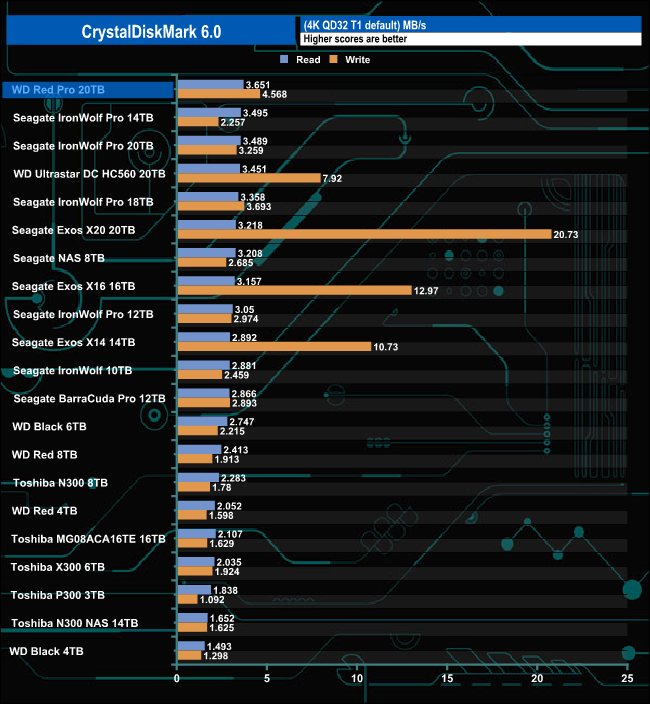 In the CrystalDiskMark 4K QD32 T1 test, the 20TB WD Red posted the best read score to date for a mechanical hard drive of 3.651MB/s. Its write performance of 4.568MB/s is also impressive but is some way behind the other 20TB WD drive we've recently reviewed, the enterprise focussed Ultrastar DC HC560.