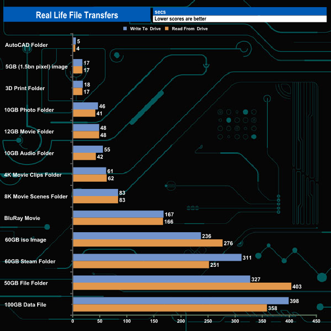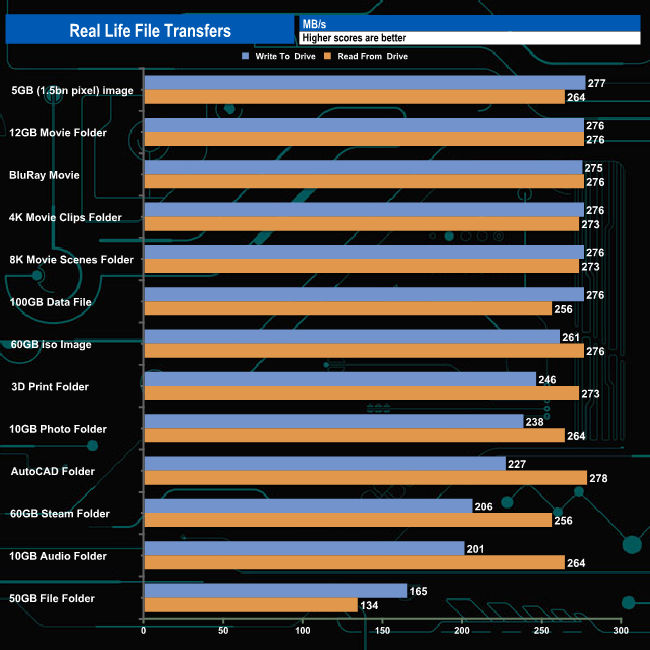 To test the real-life performance of a drive we use a mix of folder/file types and by using the FastCopy utility (which gives a time as well as MB/s result) we record the performance of drive reading from & writing to a 256GB Samsung SSD850 PRO.