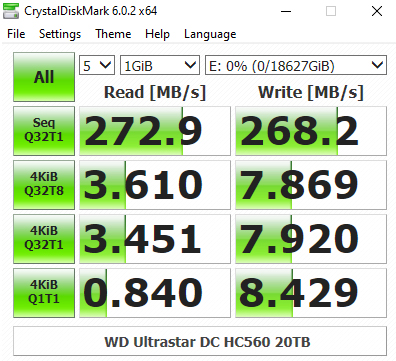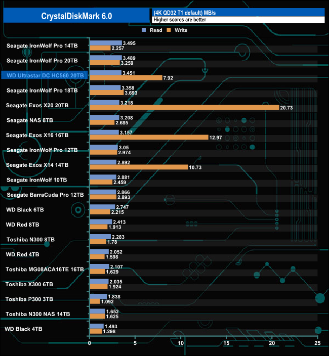In the CrystalDiskMark 4K QD32 T1 test, the 20TB Ultrastar DC HC560 read test result of 3.451MB/s sees it sitting in third place in our results chart just behind the 14TB and 20TB IronWolf Pro's. However, its write result of 7.92MB/s is much better than both the Seagate drives and is by far the fastest write result for any WD HDD we've seen to date.