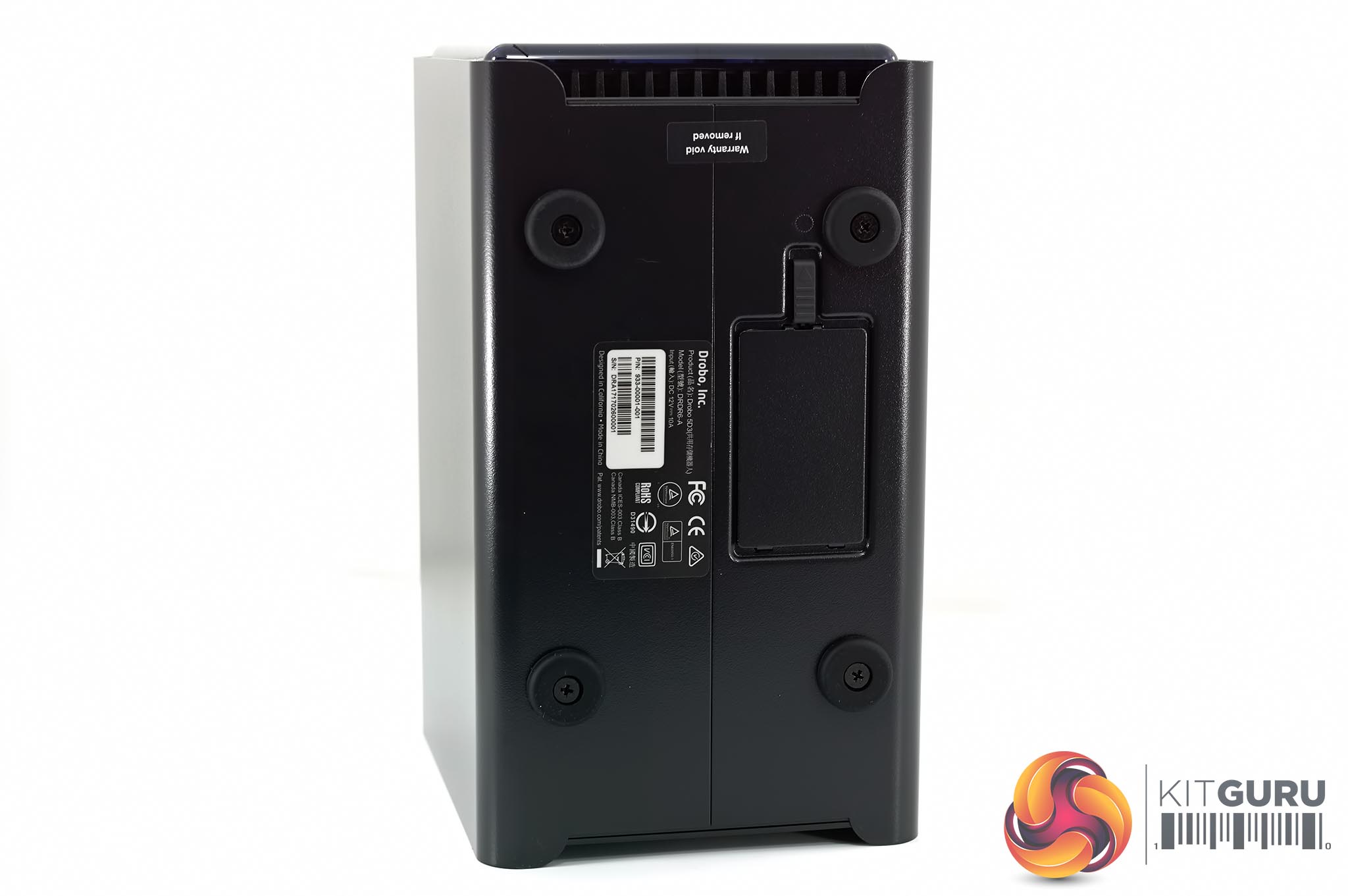 The Drobo 5D3 is a simple black DAS with a reflective plastic panel on the front. This panel is not held in place with screws, but with a special magnetic style surface that attracts and holds the cover in place.