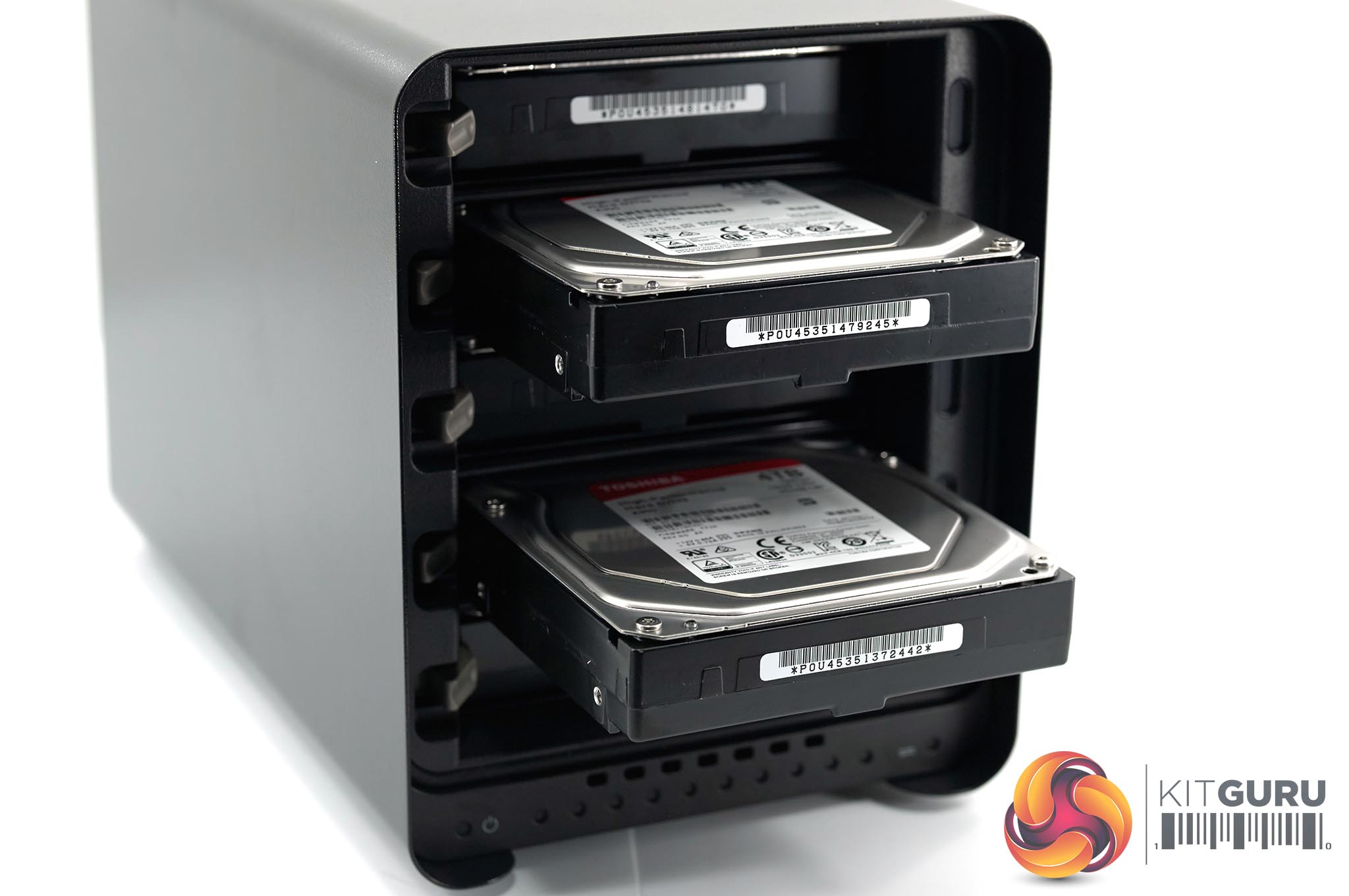 Like everything else so far – installing the 3.5 inch drives is tool-less. Simply slide the drive(s) – label side up into the bays and they lock home. To remove them, push on the grey lever at the left of each bay and pull them out again. Its a very secure system, and its hard not to be impressed so far with the ease of set up. That said, the software side of a DAS or NAS can make or break it, so we reserve final judgement until later.