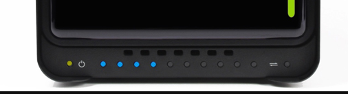 Firstly on the far left of the panel is a green LED which indicates that the Drobo 5D3 is switched on. The indicator on the far right shows that data is being moved between the system and the 5D3. In the center is a row of 10 blue LED's. These actually indicate how much of the available space is already in use. The image above shows 4 blue LED lights which indicate that 40% of the RAID's capacity is in use.