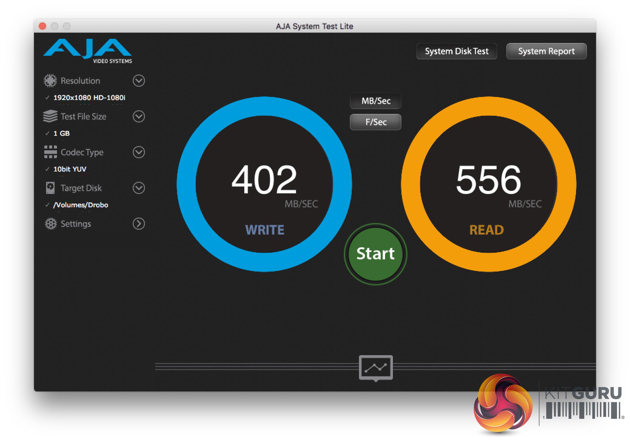 The AJA benchmark shows quite similar results to the Blackmagic test, hitting 402 MB/s in the write test and 556 MB/s in the read test.
