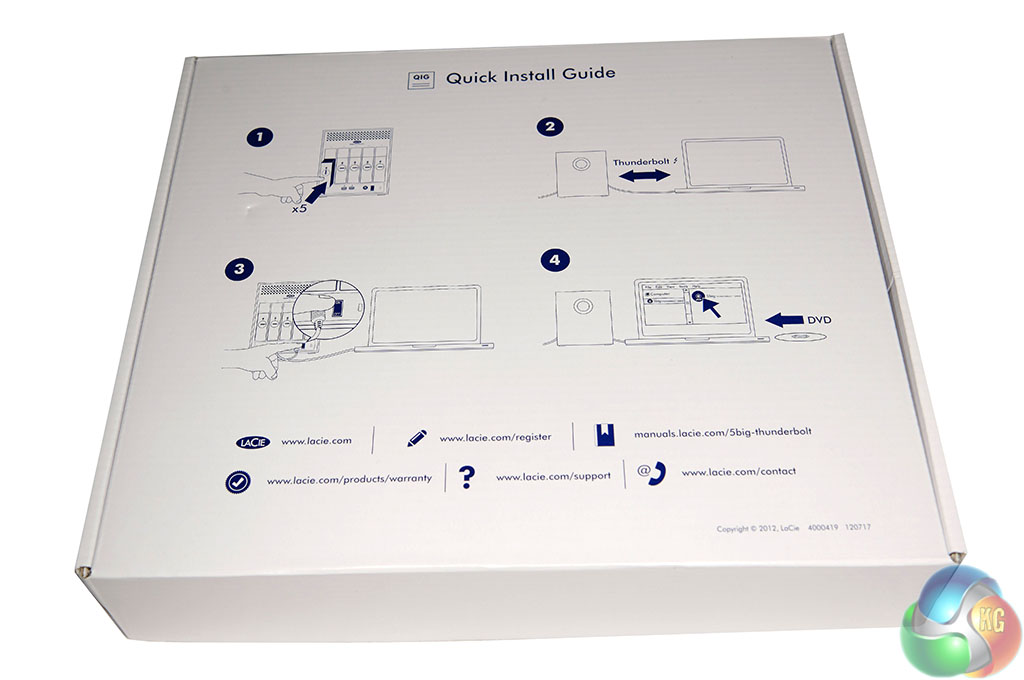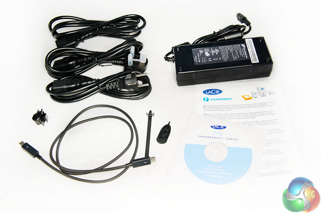 Inside is a flat box, which cleverly doubles up as a Quick Installation Guide. Inside this box, is a software disc, Thunderbolt connector, power supply and three different power connectors to target European, US and UK audiences.
