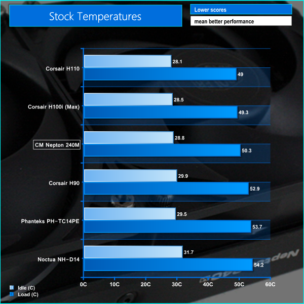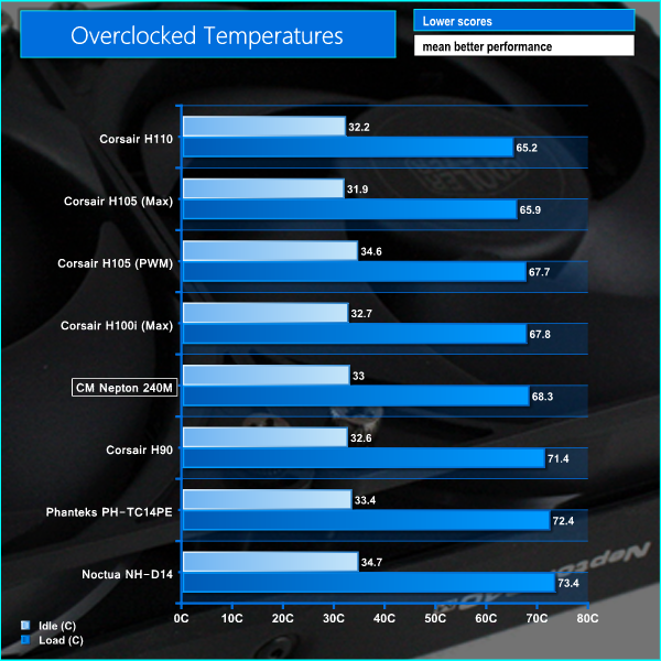 These temperatures reflect almost exactly what we would expect from the Nepton 240M. They are similar to competing coolers, although can't quite match the performance of the comparable Corsair H105.