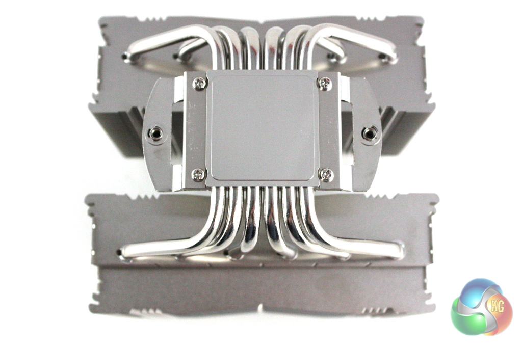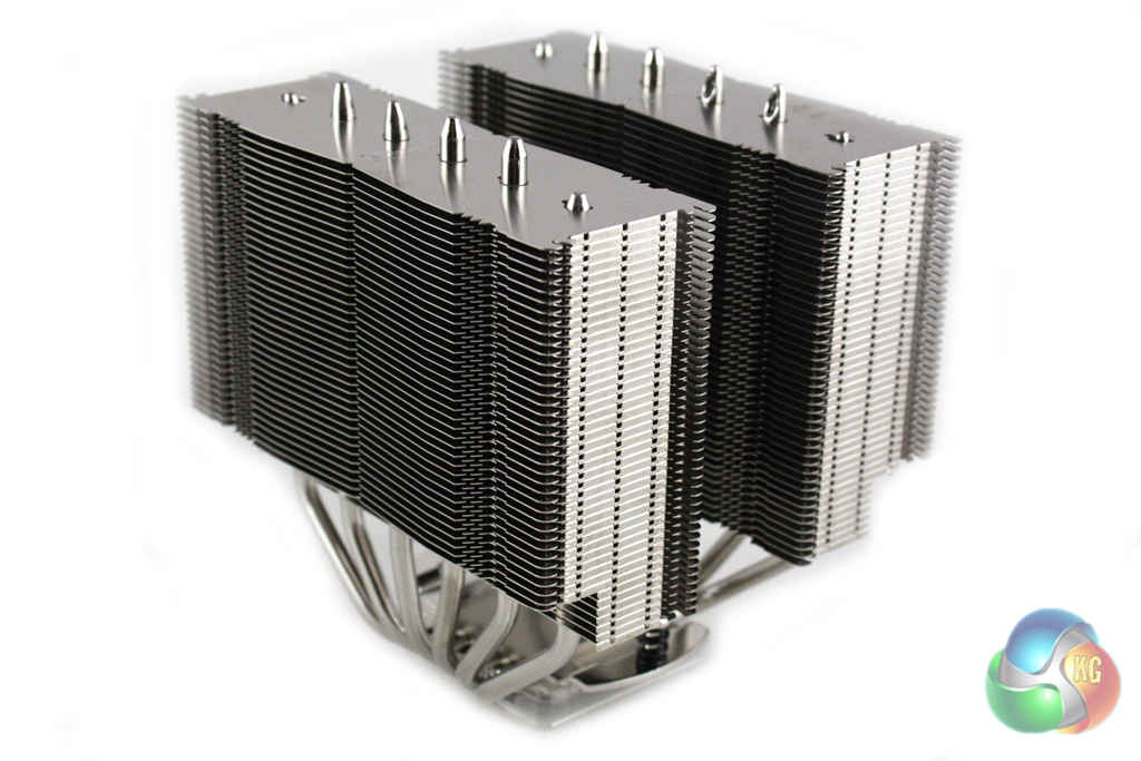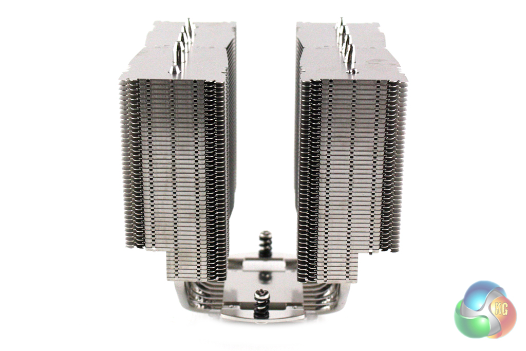 Noctua has retained the dual tower configuration, with a series of aluminium fins arrange across the six nickel-plated copper heatpipes. These heatpipes measure 6mm in diameter and are U-shaped, meaning each heatpipe passes through both towers and the CPU block in the centre.
