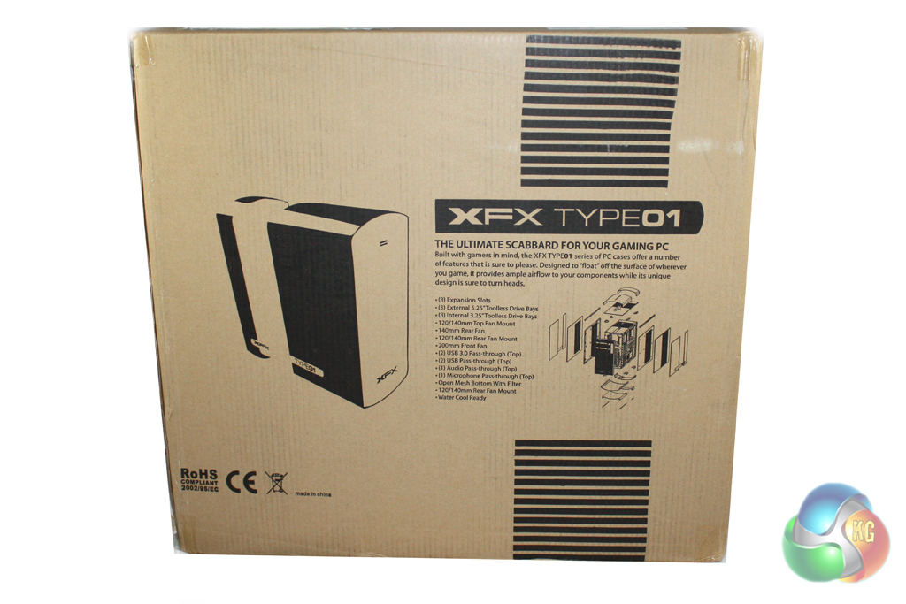 The XFX Type01 Bravo is supplied in a traditional looking box decorated in a black and brown livery. The front simply features a Type01 logo alongside a pattern which hints at the design of the case within.
