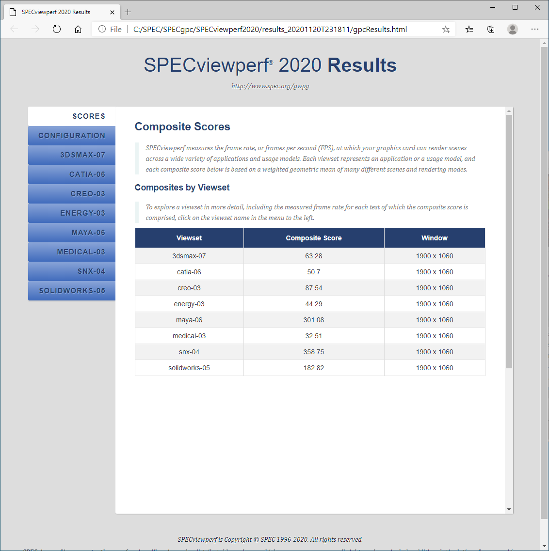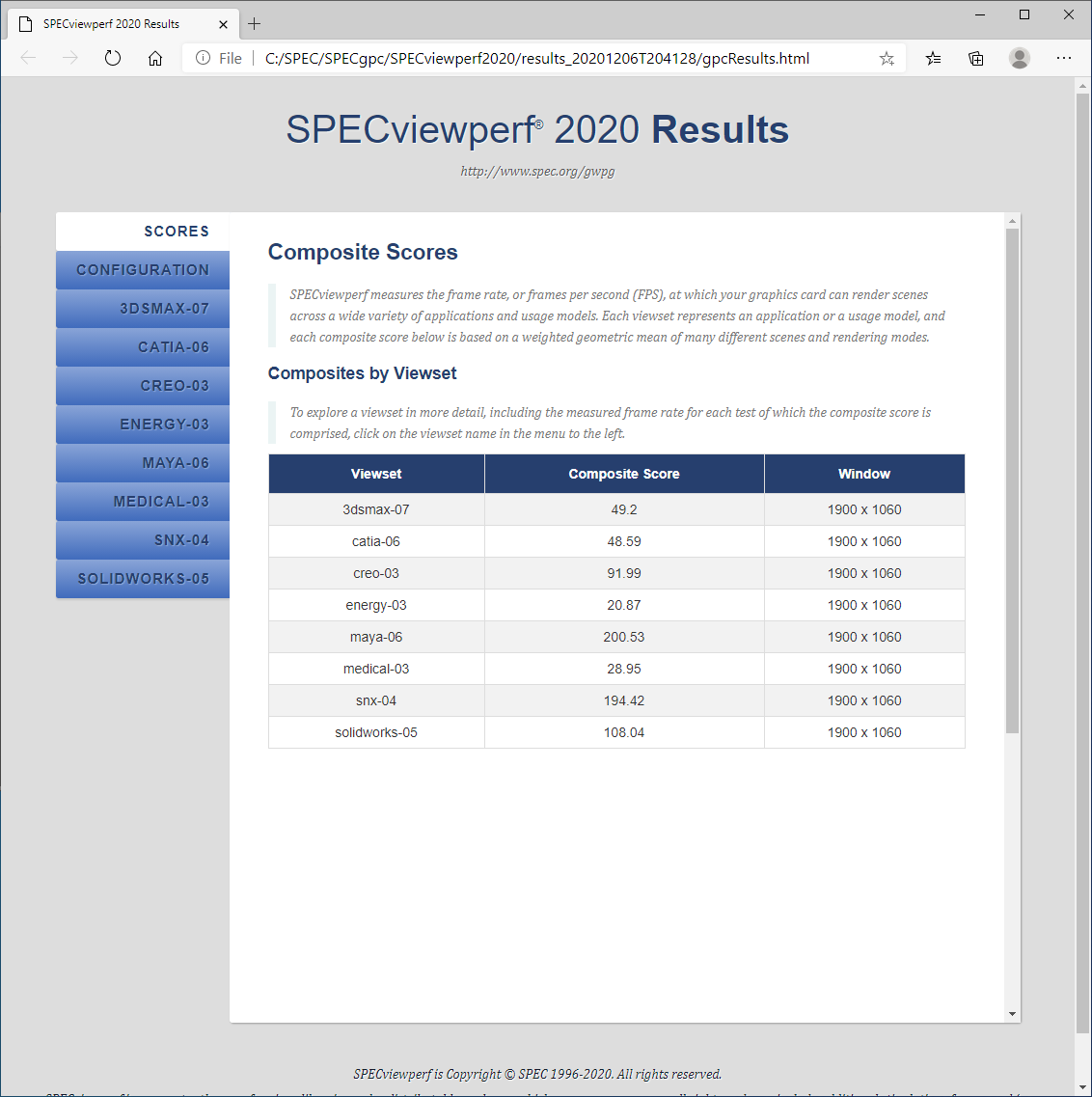 The SPECviewperf® 2020 benchmark, released on October 14, 2020, is the worldwide standard for measuring graphics performance based on professional applications. The benchmark measures the 3D graphics performance of systems running under the OpenGL and Direct X application programming interfaces. The benchmark’s workloads, called viewsets, represent graphics content and behavior from actual applications, without the need to install the applications themselves.