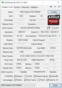 The AMD Radeon Pro W6800 is so new that TechPowerUp GPU-Z doesn't recognise it properly. However, it correctly detects the 3,840 Stream Processors, PCI Express 4.0 bus and 256-bit memory bus.