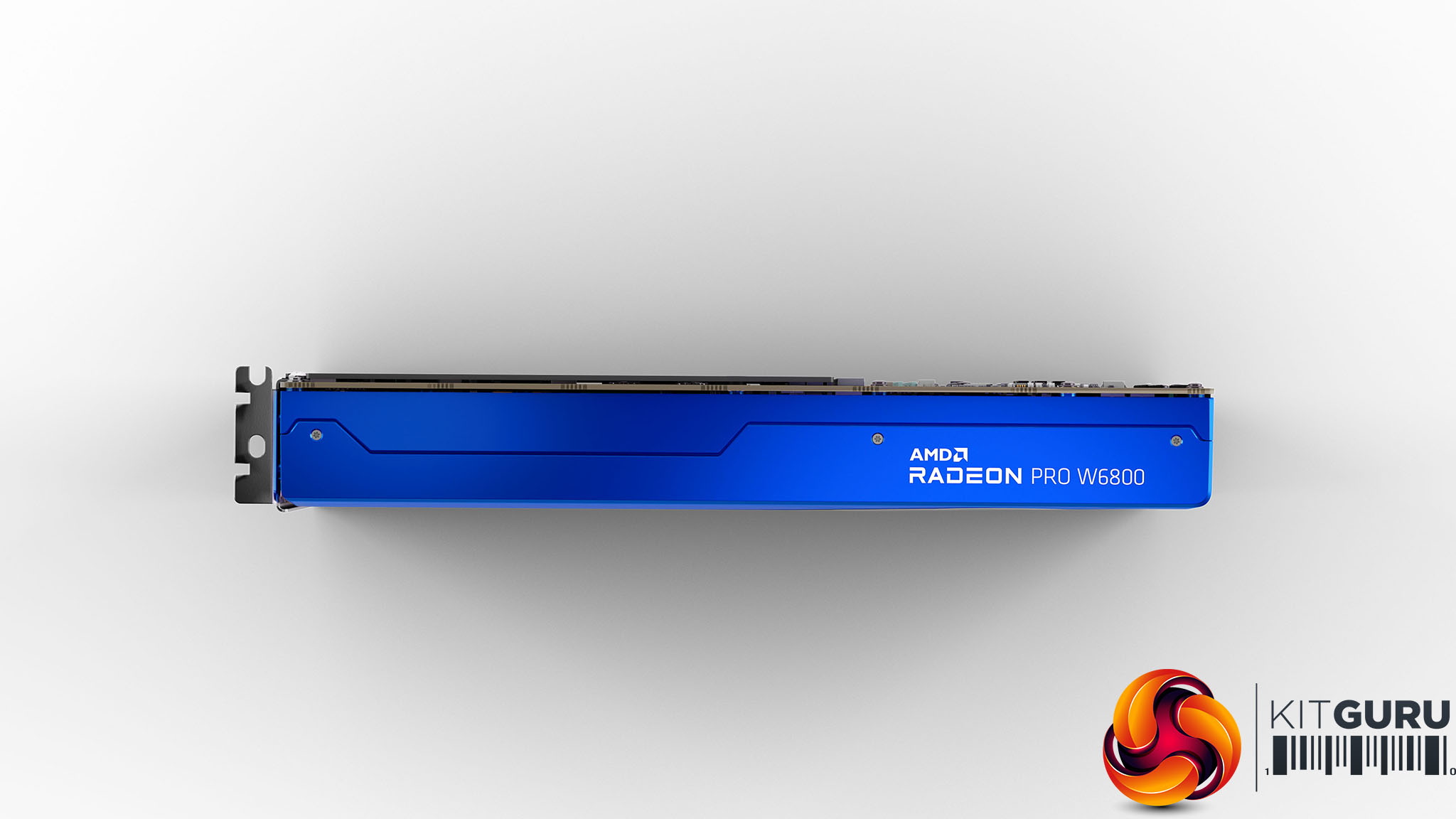 The Radeon Pro W6800 maintains the familiar blue appearance of recent Radeon Pros, with the silver strip down the middle showing the model and branding. This is a hefty dual-slot card, with a reassuringly solid build and decently sized fan, although just a single one.