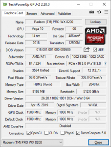 For graphics, we had an AMD Radeon Pro WX 8200 on hand so used that to provide a decent level of GPU grunt for a workstation. This high-end 3D accelerator sports 3,584 Stream Processors running at a base 1,200MHz with a 1,500MHz boost. There's a decent 8GB of HBM2 memory on a 2,048-bit bus running at 1,000MHz and delivering a massive 512GB/sec bandwidth.