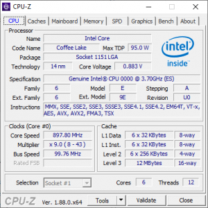 The CPU we were sent was an engineering sample, hence its model number didn't register in CPU-Z. But you can see that its default clock speed is 3.7GHz, with six cores and Hyper-Threading. The Xeon E 2176 G has a 4.7GHz Turbo mode for one core, 4.6GHz for two cores, and 4.3GHz for six cores. This makes it basically the Xeon version of the Intel Core i7 8700K, so a generation behind the eight-core 9700K that arrived at the end of 2018.