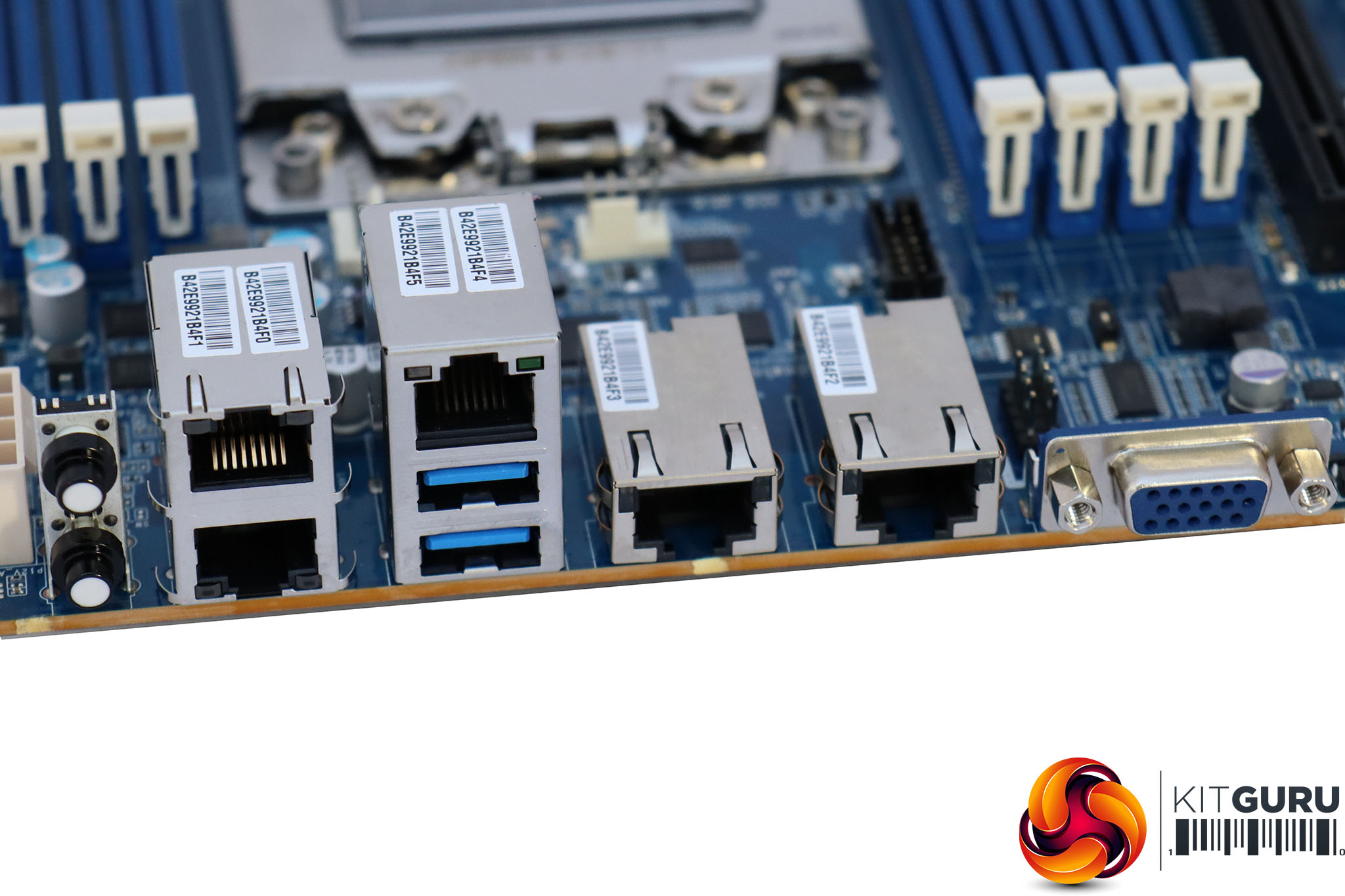 However, the backplane itself doesn't have much connectivity, apart from the plethora of Ethernet ports. One of these LAN ports is dedicated to remote management, above two USB 3.0 ports, with two Gigabit Ethernet ports to the left and two 10Gigabit Ethernet ports on the right. Furthest right is a VGA video output, driven by the ASPEED AST2500 chipset. On the far left are power and reset buttons.