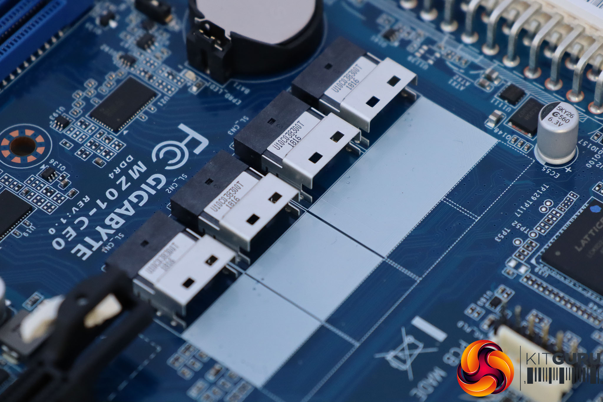 There is only a single M.2 slot, for a boot drive SSD, but you also get the four SlimSAS connectors. You can't hook up a SATA hard disk to one of these directly, however. Instead, you will need to get hold of breakout cables, although one routing a SlimSAS to four SATA III 6Gb/sec connections is only about £15.
