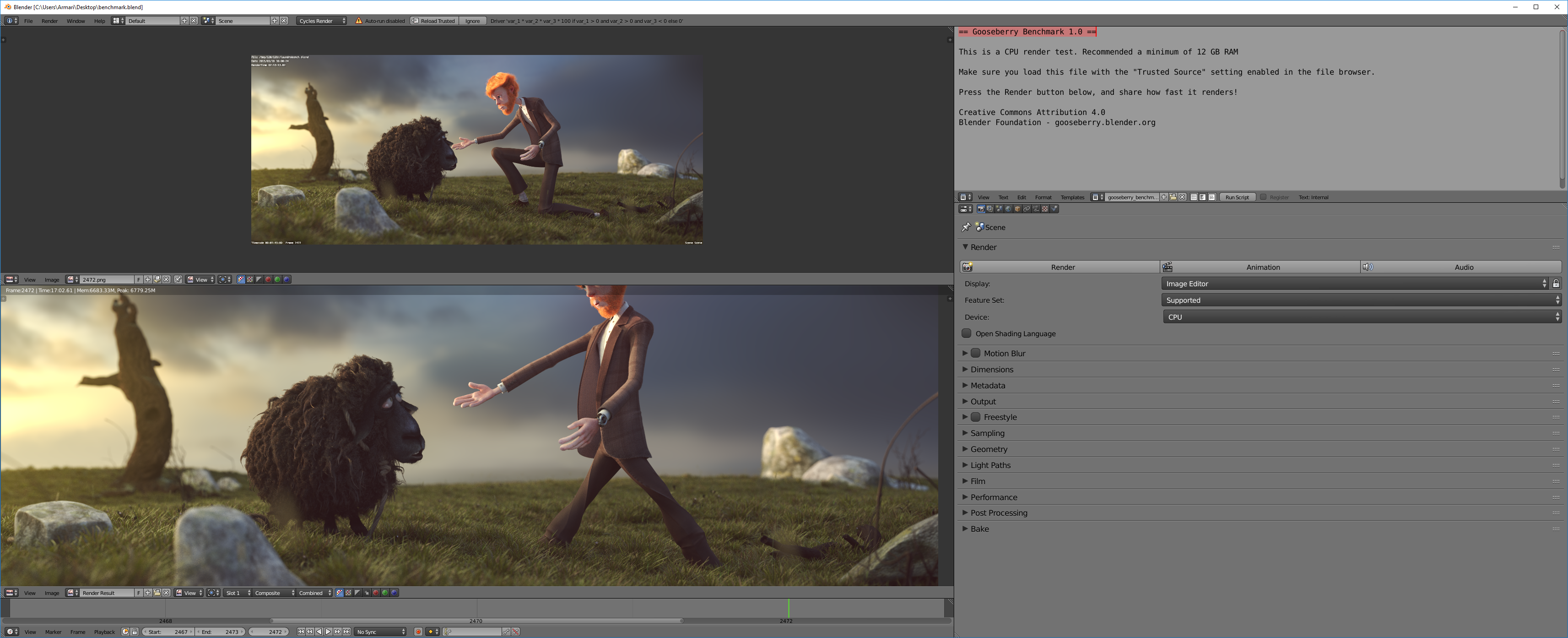For this test, we used the Gooseberry Production Benchmark. Project Gooseberry is the code name for the Blender Institute's 6th open movie, Cosmos Laundromat — a 10-minute short, the pilot for the planned first-ever free/open source animated feature film. The benchmark renders a single frame from this film in intermediate quality.