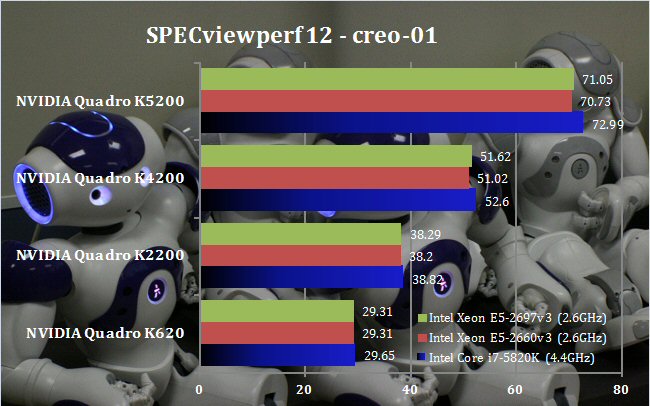 Creo is even less sensitive to the CPU speed than CATIA, and here even the Quadro K5200 gains only a small benefit from the extra clock speed of the Core i7. So opting for a faster processor won't provide much extra here. The delta between cards as you move up the range is less pronounced, too. You only get around 30 per cent by upgrading from the K620 to the K2200, about 35 per cent from the K2200 to the K4200, and around 39 per cent from the latter to the K5200. So the benefit of spending extra on graphics is less for Creo than for CATIA, even if it's still quite notable.