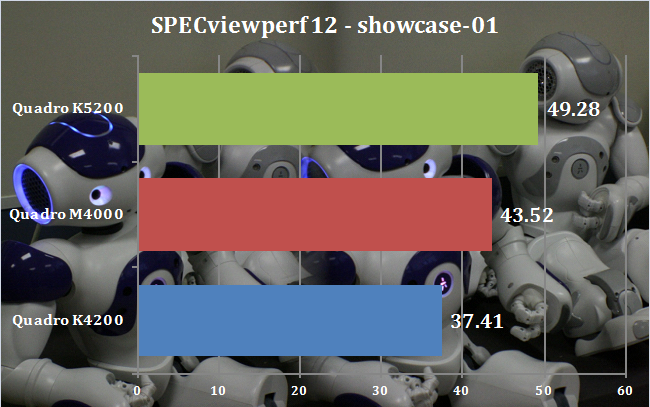 This test is unusual because it measures DirectX rather than OpenGL performance. But results are similar to medical-01, with the M4000 around 16 per cent ahead of the K4200 and 13 per cent behind the K5200. So our conclusion is the same – another win for the M4000, but K5200 owners can rest easy.