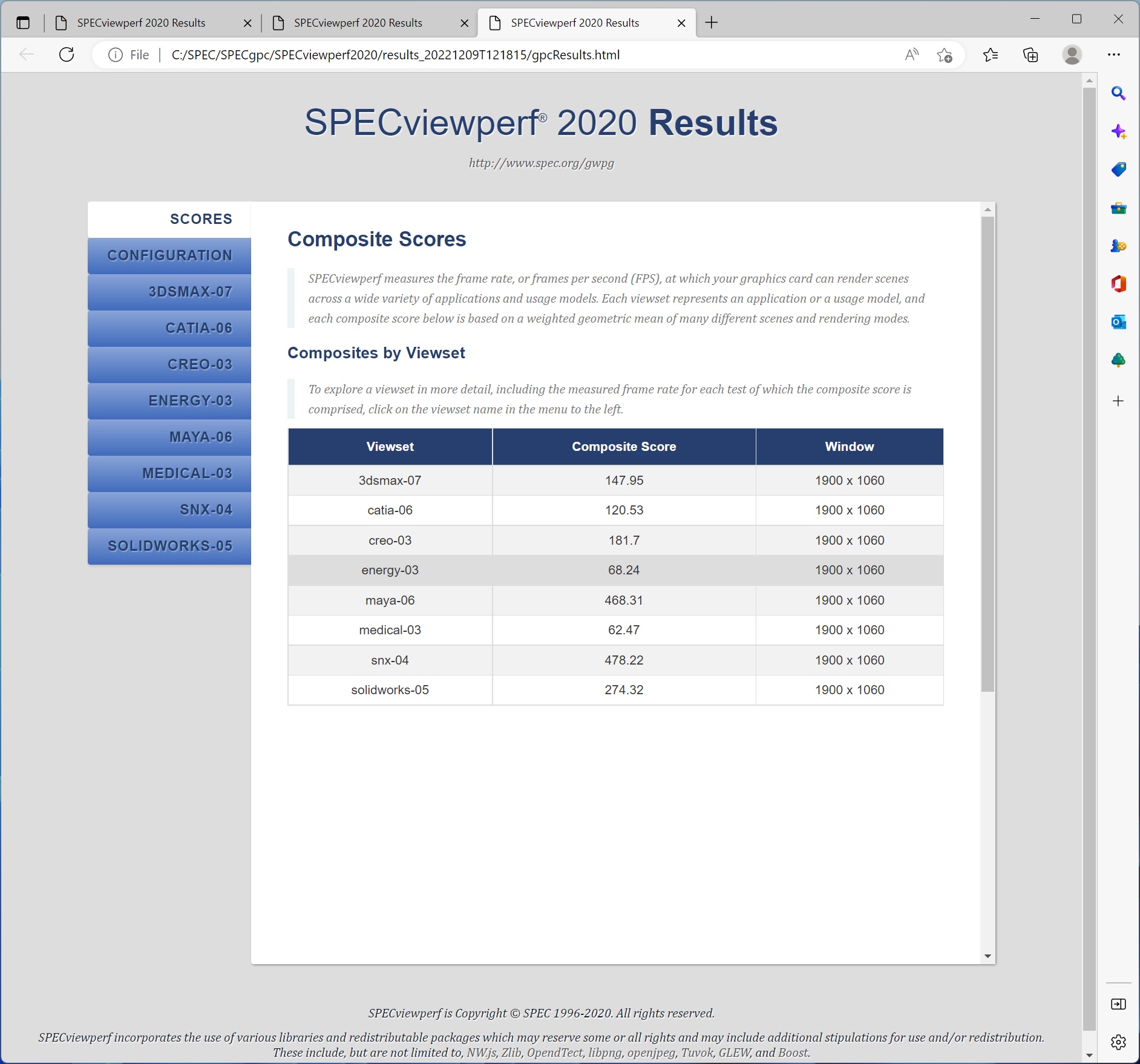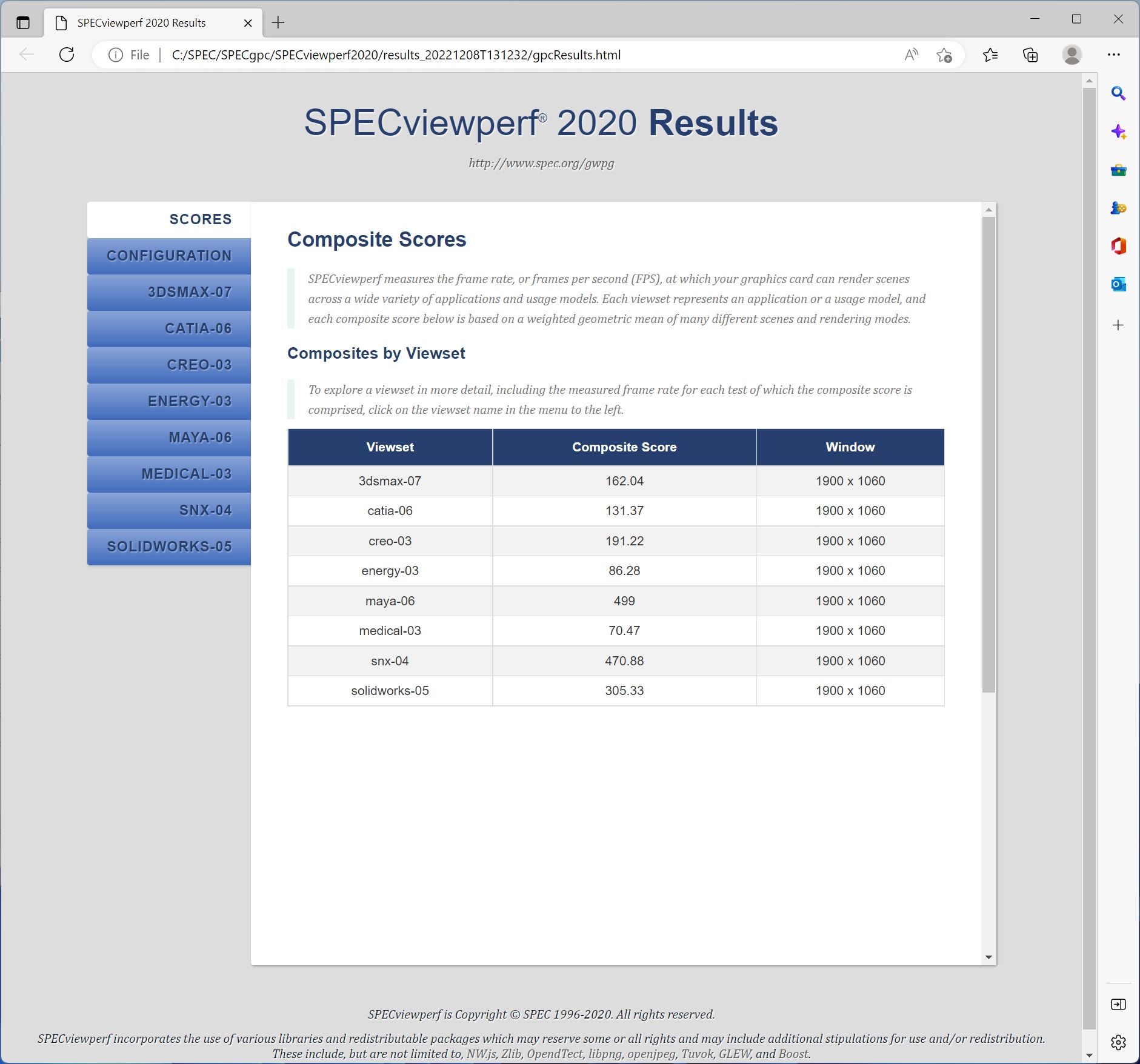 The SPECviewperf® 2020 benchmark, released on October 14, 2020, is the worldwide standard for measuring graphics performance based on professional applications. The benchmark measures the 3D graphics performance of systems running under the OpenGL and Direct X application programming interfaces. The benchmark’s workloads, called viewsets, represent graphics content and behaviour from actual applications, without the need to install the applications themselves.
