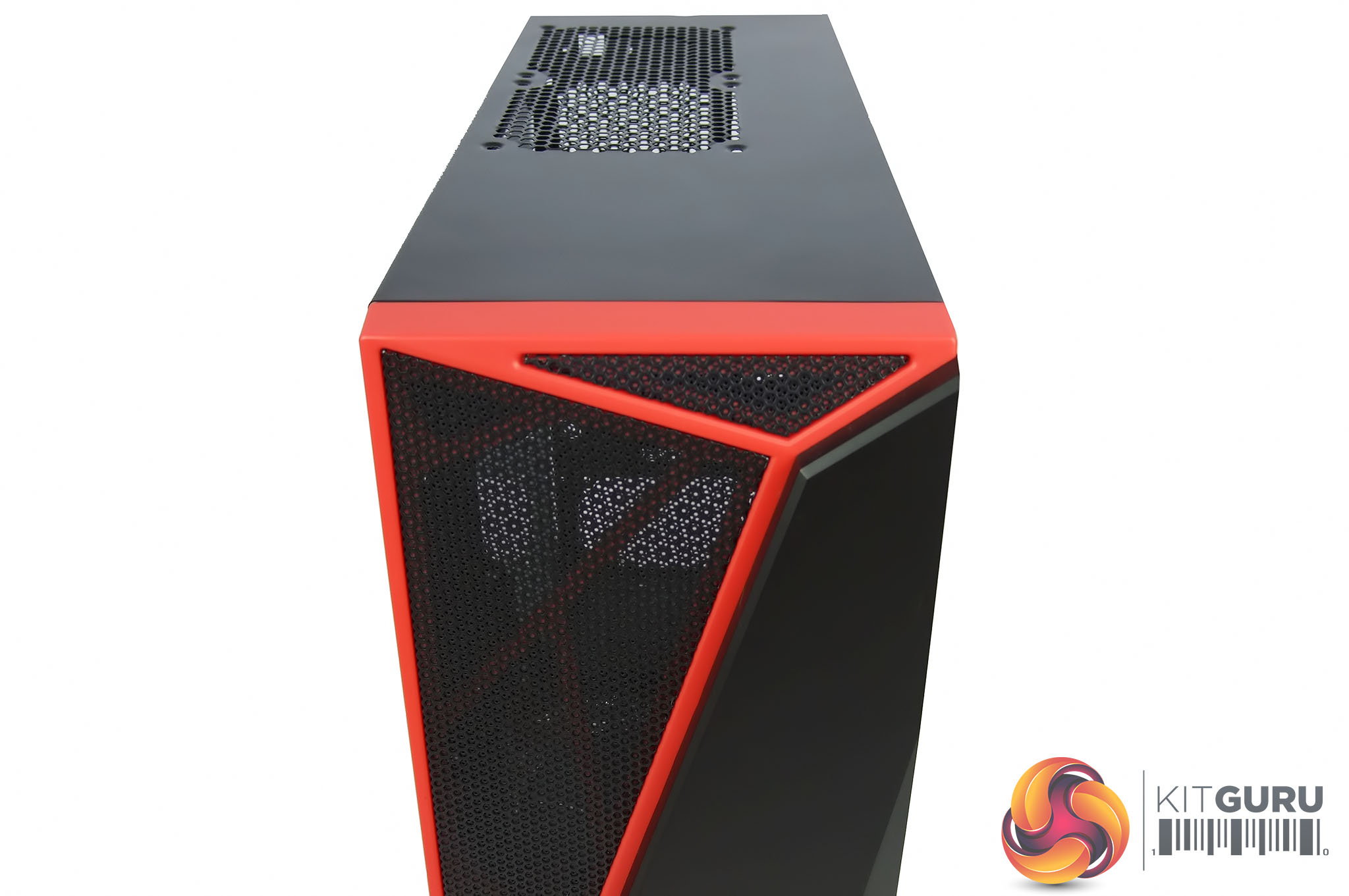 A quick look around the case is enough to refresh our memories. The I/O is at the top of the front-right edge of the case, leaving the front panel an untouched experiment in geometric design. If we peek over the top of the front panel, we see two fan bays available for added cooling.