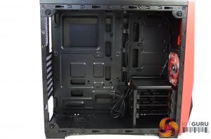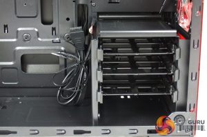 Below the installed intake fan the case offers three brackets for 3.5” drives. To the left of the drive bays, we find the cables bundled and ready to go. It’s important to note that the cables came bundled with a wire tie, not a cable tie as shown.