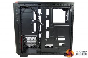 Nothing problematic: to the bottom left is a standard PSU dust cover, and everything else appears sensibly designed. What is immediately apparent, and most obvious, is the space in the top-right of the case: a lack of any drive bays means for easy installation of an additional intake fan.