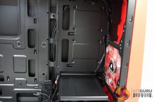 An inspection of the ‘back’ view allows a better look at cable routing options for the Carbide Spec-04 Tempered Glass as well as the rear of the motherboard tray. Everything is neatly compact, and there appear no major problems. My only minor concern here is the spacing of those 2.5” disk mounting areas right next to a cable routing cut-out. They might prove fiddly.