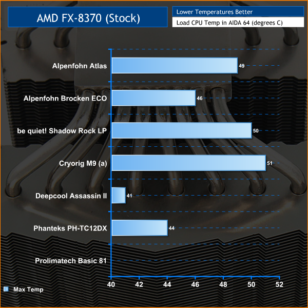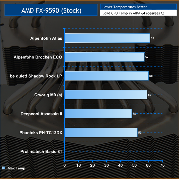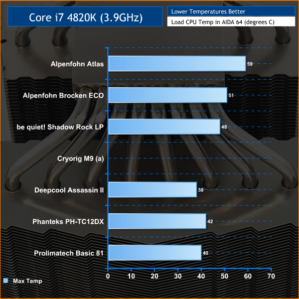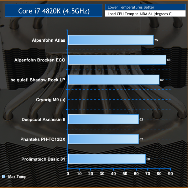 Lastly, for easy comparison, we have created side-by-side graphs for the maximum temperatures that were measured with each of the cooling solutions in the 4820K (at 3.9GHz), 4820K (4.5GHz), FX-3870 (stock) and FX-9590 (stock). Missing bars means that there was no score for that cooler, for example on the 4820K charts, there is no score for the Cryorig M9 (i) because that cooler does not support LGA2011.