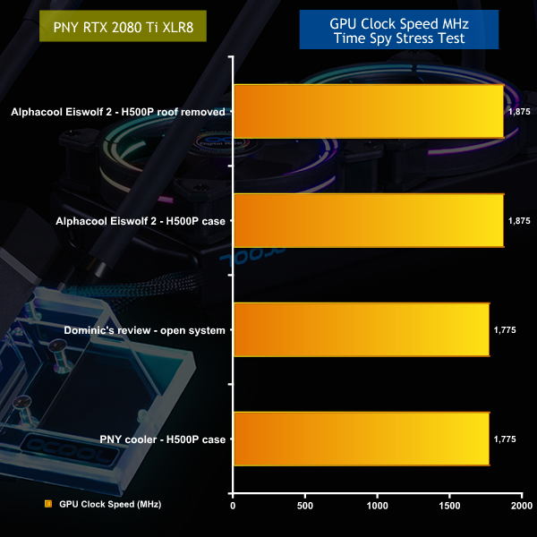Using the Alphacool Eiswolf 2 on our PNY RTX 2080 Ti Gaming XLR8 was a win-win-win with lower temperatures, higher clock speeds and extra performance. We were running the 200mm case fans at 900rpm and the two 120mm Alphacool fans on the radiator at 1,400rpm and can assure you that noise levels were pleasingly low.