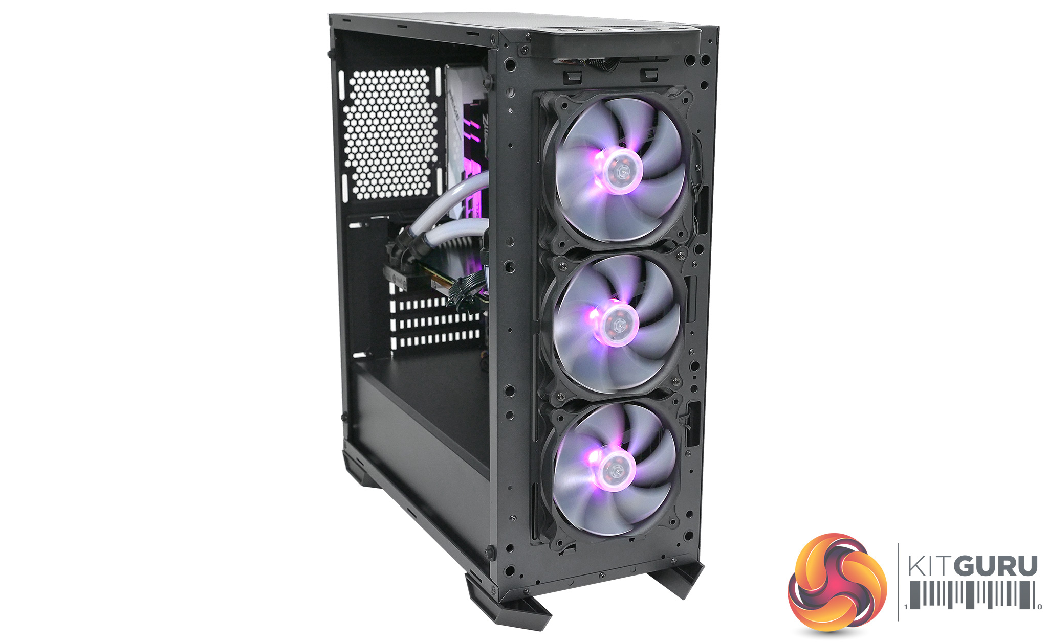 In stock configuration you control the lighting in the fans by toggling the button on the front panel through red, green, blue, orange, purple, neon green and white. This works exactly as you would expect and if you have never experienced RGB before we imagine you will be happy. On the other hand if you know something about RGB you will want to daisy chain the cables together and connect them to your motherboard, just as we did with the Asus Prime X299-A, and then used Aura to control the lighting. The annoyance, as mentioned, is that most people will struggle to connect three front fans to their motherboard and will probably want to add a rear or top exhaust fan to complete the airflow equation.